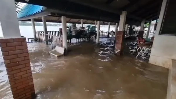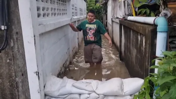 ชุมชนแสงเทียน ต.สวนใหญ่ อ.เมือง จ.นนทบุรีน้ำทะเลหนุนสูงชาวบ้านริมแม่น้ำเจ้าพระยาได้รับผลกระทบหนัก น้ำล้นตลิ่งเข้าบ้านเรือนประชาชนสูงต้องเดินลุยน้ำในบ้านนานหลายวัน