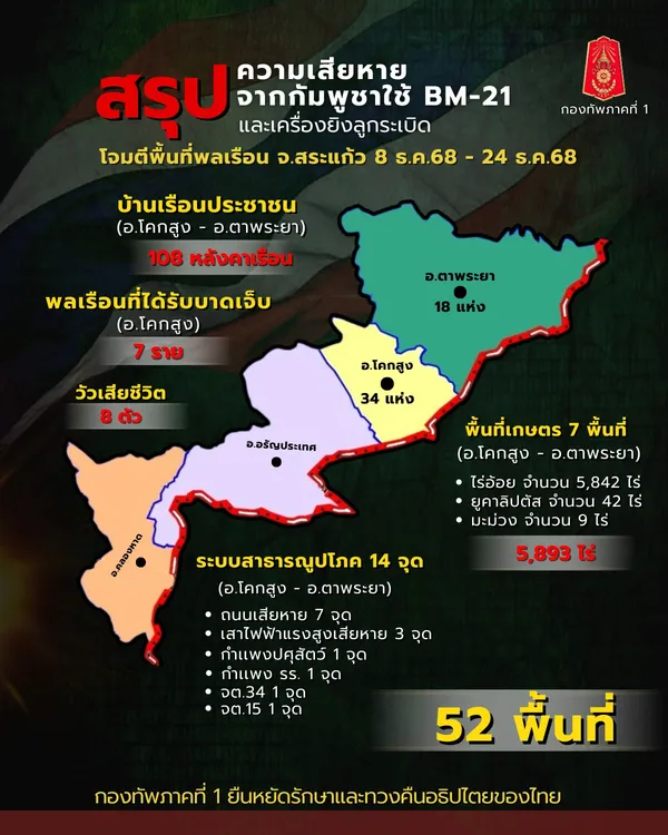 กองทัพภาคที่ 1 ได้สรุปรายงานความเสียหายที่เกิดขึ้นกับพื้นที่พลเรือนในจังหวัดสระแก้ว จากกรณีที่กัมพูชาได้มีการใช้จรวดหลายลำกล้อง BM-21 และเครื่องยิงลูกระเบิดโจมตีเข้ามายังฝั่งไทย ในช่วงระหว่างวันที่ 8 ธันวาคม ถึง 24 ธันวาคม พ.ศ. 2568 โดยส่งผลกระทบอย่างรุนแรงต่อทรัพย์สินและชีวิตความเป็นอยู่ของประชาชนในพื้นที่อำเภอโคกสูง และอำเภอตาพระยา