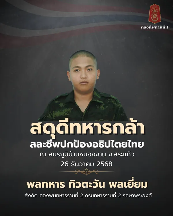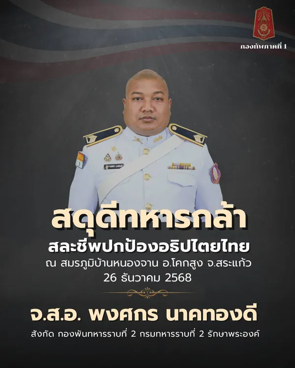 กองทัพภาคที่ 1 ออกแถลงการณ์แสดงความเสียใจอย่างสุดซึ้งต่อครอบครัวของกำลังพลผู้เสียชีวิตจากการปฏิบัติหน้าที่ปกป้องอธิปไตยของชาติ บริเวณพื้นที่ชายแดนไทย–กัมพูชา บ้านหนองจาน อำเภอโคกสูง จังหวัดสระแก้ว