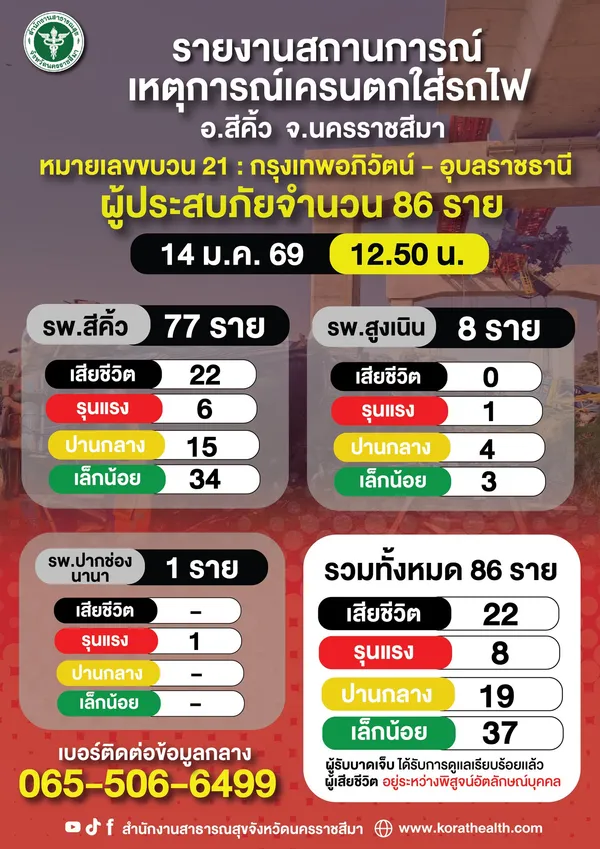 สำนักงานสาธารณสุขจังหวัดนครราชสีมา รายงานสถานการณ์ เหตุการณ์เครนตกใส่รถไฟ อ.สีคิ้ว จ.นครราชสีมา