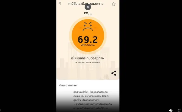 ประชาชนชาวจังหวัดหนองคายยังต้องเผชิญกับ วิกฤตฝุ่น PM 2.5 ที่พุ่งสูงขึ้นอย่างต่อเนื่องตลอดทั้งสัปดาห์ โดยเช้านี้(18 ม.ค.) ที่สถานีตรวจสอบคุณภาพอากาศ สวนสาธารณะหนองถิ่น ตำบลมีชัย อำเภอเมือง จังหวัดหนองคาย ตรวจวัดค่าฝุ่น PM 2.5 ได้สูงถึง 69.2 ไมโครกรัมต่อลูกบาศก์เมตร ดัชนีคุณภาพอากาศ อยู่ที่ 185 AQI อยู่ในเกณฑ์สีส้ม มีผลกระทบต่อสุขภาพ