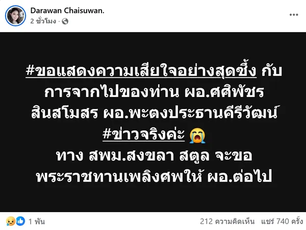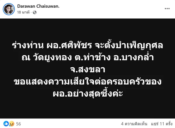 ขณะที่เฟซบุ๊ก "Darawan Chaisuwan." ก็ได้โพสต์ข้อความว่า #ขอแสดงความเสียใจอย่างสุดซึ้ง กับการจากไปของท่าน ผอ.ศศิพัชร สินสโมสร ผอ.พะตงประธานคีรีวัฒน์ ทาง สพม.สงขลา สตูล จะขอพระราชทานเพลิงศพให้ ผอ.ต่อไป