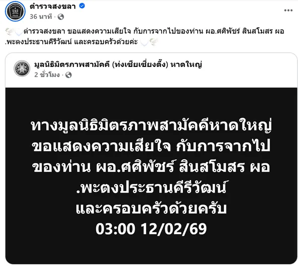 ล่าสุดเพจเฟซบุ๊ก ตำรวจสงขลา ได้แชร์โพสต์ของ มูลนิธิมิตรภาพสามัคคี (ท่งเซียเซี่ยงตึ๊ง) หาดใหญ่ ซึ่งได้แจ้งข่าวเศร้า
