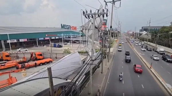จากภาพในที่เกิดเหตุพบว่า เต็นท์ผ้าใบขนาดใหญ่ ถูกลมยกตัวจนเสียรูป ห้อยพาดอยู่กับแนวสายไฟฟ้าเหนือกำแพง ขณะที่ บริเวณด้านล่าง เจ้าหน้าที่ได้นำ เทปกั้นเขตสีแดง-ขาว มากั้นพื้นที่โดยรอบ เพื่อป้องกันไม่ให้ประชาชนเข้าใกล้จุดเสี่ยงอันตราย เนื่องจากเกรงว่าจะเกิดกระแสไฟฟ้ารั่วไหล หรือโครงสร้างเต็นท์อาจหล่นลงมา