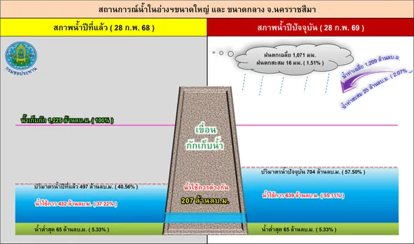 อย่างไรก็ตาม พายุฤดูร้อนที่ทำให้ฝนตกหนักในช่วงนี้ // ได้ช่วยเติมน้ำลงในเขื่อนและอ่างเก็บน้ำในพื้นที่เล็กน้อย// โดยเมื่อวานนี้ มีปริมาณน้ำไหลลงอ่างเก็บน้ำในพื้นที่หลายแห่ง อย่างเช่น อ่างเก็บน้ำลำตะคอง ที่อำเภอสีคิ้ว อ่างเก็บน้ำขนาดใหญ่ที่สุดของจังหวัด // มีภารกิจส่งจ่ายน้ำไปให้ประชาชนถึง 5 อำเภอได้ใช้อุปโภค-บริโภค // มีน้ำไหลลงอ่างฯ 0.072 ล้านลูกบาศก์เมตร ล่าสุด ปริมาณน้ำเก็บกักของอ่าง คิดเป็นร้อยละ 44.35 // ส่วนอ่างเก็บน้ำลำแชะ ที่อำเภอครบุรี ซึ่ง เป็น 1 ใน 4 อ่างเก็บน้ำขนาดใหญ่ของจังหวัด ปัจจุบันเหลือน้ำเก็บกักมากสุด โดยมีปริมาณน้ำคิดเป็นร้อยละ 69.34 ของความจุกักเก็บทั้งหมด // ในขณะที่คุณภาพอากาศหลังจากมีฝนตกหนักหลายพื้นที่ พบว่า ค่าฝุ่น PM 2.5 ลดลง และคุณภาพอากาศดีขึ้น