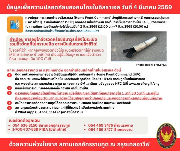 สถานเอกอัครราชทูตณกรุงเทลอาวีฟ ออกคำเตือนแก่คนไทย วันนี้ 4 มี.ค. 69 เวลา 12.00 น. ตามเวลาไทย ย้ำให้คนไทยในอิสราเอล ติดตามข่าวของทางการอย่างใกล้ชิดและปฏิบัติตามข้อแนะนำ home front command คือ ให้หลีกเลี่ยงการเดินทางนอกที่พักอาศัยหากไม่จำเป็น รวมถึงการตรวจสอบที่หลบภัยใกล้ที่พักหรือที่ทำงาน เมื่อได้รับสัญญาณให้เข้าที่หลบภัยภายใน 90 วินาที และอยู่ในที่หลบภายในอย่างน้อย 10 นาทีจนกว่าจะได้รับสัญญาณว่าปลอดภัยและงดออกจากที่หลบภัยเพื่อบันทึกภาพ