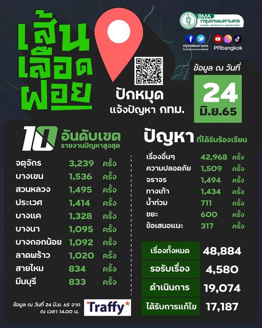วันนี้ (25 มิ.ย.65) กรุงเทพมหานคร โดยสำนักงานประชาสัมพันธ์ รายงานปัญหาเส้นเลือดฝอย ในพื้นที่กรุงเทพมหานคร ข้อมูล ณ วันที่ 24 มิถุนายน 2565
