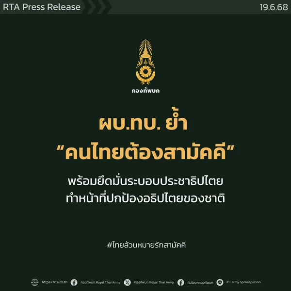 ทั้งนี้ ผู้บัญชาการทหารบกได้เน้นย้ำว่า หากพิจารณาอย่างรอบด้านแล้ว สิ่งที่สำคัญที่สุดในห้วงเวลานี้คือ “คนไทยต้องสามัคคี” ร่วมกันปกป้องอธิปไตยจากผู้ไม่หวังดี โดยยึดถือผลประโยชน์ของชาติเป็นสำคัญ