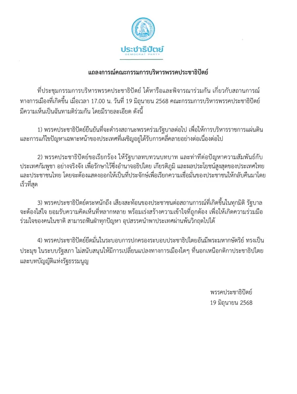 ผู้สื่อข่าวรายงานว่า คณะกรรมการบริหารพรรคประชาธิปัตย์ ออกแถลงการณ์หลังได้ที่ประชุมกรรมการบริหารพรรคประชาธิปัตย์ ได้หารือและพิจารณาร่วมกัน เกี่ยวกับสถานการณ์ทางการเมืองที่เกิดขึ้น เมื่อเวลา 17.00 น. วันที่ 19 มิถุนายน 2568