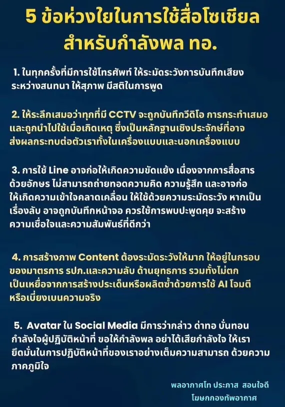 พล.อ.ท.ประภาส สอนใจดี โฆษกกองทัพอากาศ โพสต์ข้อความผ่านเฟซบุ๊ก RTAF News ซึ่งเป็นเพจข่าวอย่างเป็นทางการของกองทัพอากาศ โดยระบุว่า 5 ข้อห่วงใยในการใช้สื่อโซเชียลสำหรับกำลังพล ทอ.