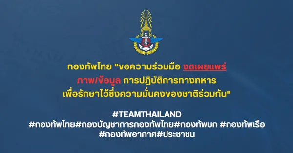 กองทัพไทยขอความร่วมมือจากประชาชนทุกท่าน งดเผยแพร่ภาพและข้อมูลเกี่ยวกับการปฏิบัติการทางทหาร เพื่อร่วมกันปกป้องความมั่นคงของชาติ รักษาอธิปไตย และบูรณภาพแห่งผืนแผ่นดินไทย
