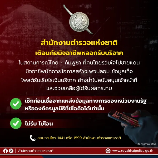 สำนักงานตำรวจแห่งชาติ เตือนภัยหลอกรับบริจาค ในสถานการณ์ชายแดนไทย-กัมพูชา ที่คนไทยรวมใจไปชายแดน มิจฉาชีพมักฉวยโอกาสสร้างเพจปลอม ข้อมูลเท็จ โพสต์รับเรี่ยไรเงินบริจาค อ้างนำไปสนับสนุนเจ้าหน้าที่ อ้างไปช่วยเหลือผู้ได้รับผลกระทบจากเหตุการณ์
