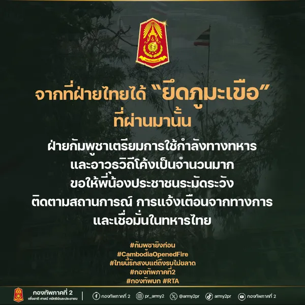 วันนี้ (26 ก.ค. 2568) กองทัพบกเปิดเผยว่า กองทัพภาคที่ 2 รายงานสถานการณ์ความคืบหน้าบริเวณชายแดนไทย-กัมพูชา โดยเมื่อเวลา 09.20 น. ได้มีการเชิญธงชาติไทยขึ้นสู่ยอด “ภูมะเขือ” อย่างเป็นทางการ หลังทหารไทยสามารถยึดคืนพื้นที่สำคัญดังกล่าวได้สำเร็จเมื่อช่วงเย็นวานนี้