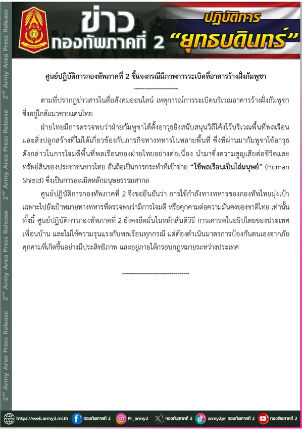 ศูนย์ปฏิบัติการกองทัพภาคที่ 2 จึงขอยืนยันว่า การใช้กำลังทางทหารของกองทัพไทยมุ่งเป้าเฉพาะไปยังเป้าหมายทางทหารที่ตรวจพบว่ามีการโจมตี หรือคุกคามต่อความมั่นคงของชาติไทย เท่านั้น