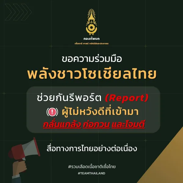 28 กรกฎาคม 2568 ผู้สื่อข่าวรายงานว่า เพจเฟซบุ๊ก กองทัพบก Royal Thai Army ได้โพสต์ข้อความ โดยขอความร่วมมือ ชาวโซเชียลไทย กดรีพอร์ต Report โพสต์หรือคอมเม้นต์ ของผู้ไม่หวังดี ที่ต้องการเข้ามา กลั่นแกล้ง ก่อกวน และโจมตี สื่อทางการไทย