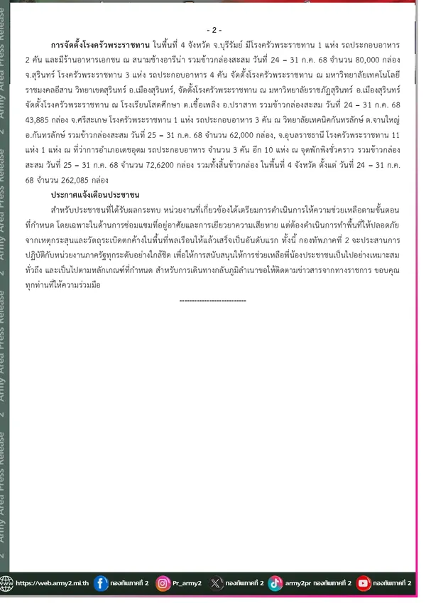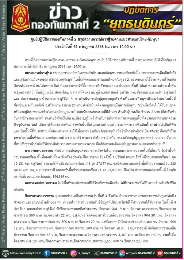 ศูนย์ปฏิบัติการกองทัพภาคที่ 2 สรุปผลการปฏิบัติที่สำคัญของสถานการณ์ถึงวันที่ 31 กรกฎาคม 2568 เวลา 14.00 น.