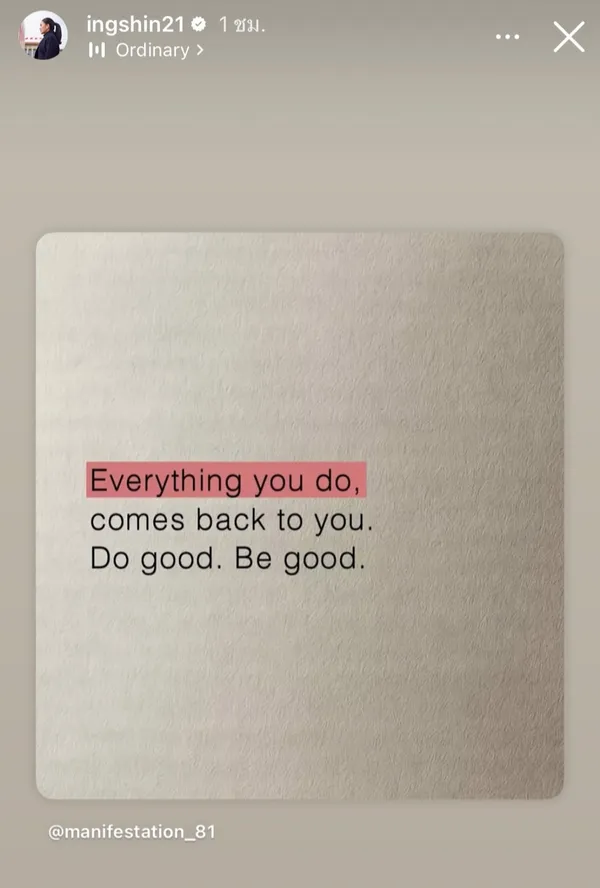 ผู้สื่อข่าวรายงานว่า เมื่อกลางดึกคืนวันที่ 14 ส.ค. ที่ผ่านมา น.ส. แพทองธาร โพสต์สตอรี่ผ่านอินสตราแกรมส่วนตัว โดยมีการโพสต์ข้อความภาษาอังกฤษ ระบุว่า "Everything you do,comes back to you.Do good. Be good." ซึ่งแปลเป็นภาษาไทยว่า"ทุกสิ่งที่คุณทำจะย้อนกลับมาหาคุณ จงทำดี จงเป็นคนดี "