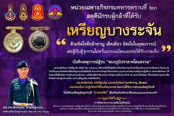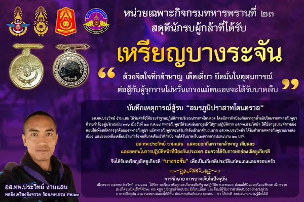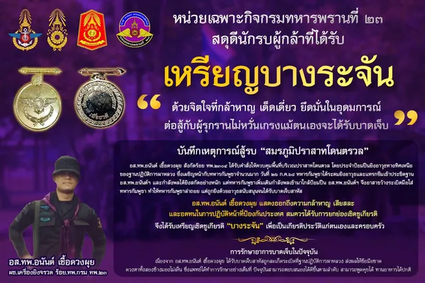 ได้ปฏิบัติหน้าที่ในการป้องกันอธิปไตย และรักษาความสงบเรียบร้อยของประเทศ ด้วยความเสียสละ กล้าหาญ อดทน สมควรได้รับการยกย่อง เชิดชูเกียรติจากกระทรวงกลาโหม ให้เป็นที่ปรากฎสืบไป
