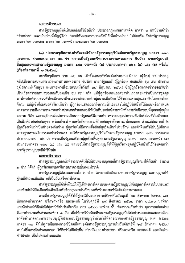 - ศาลรัฐธรรมนูญนัดวินิจฉัยคดีแพทองธารปลายสิงหาคม