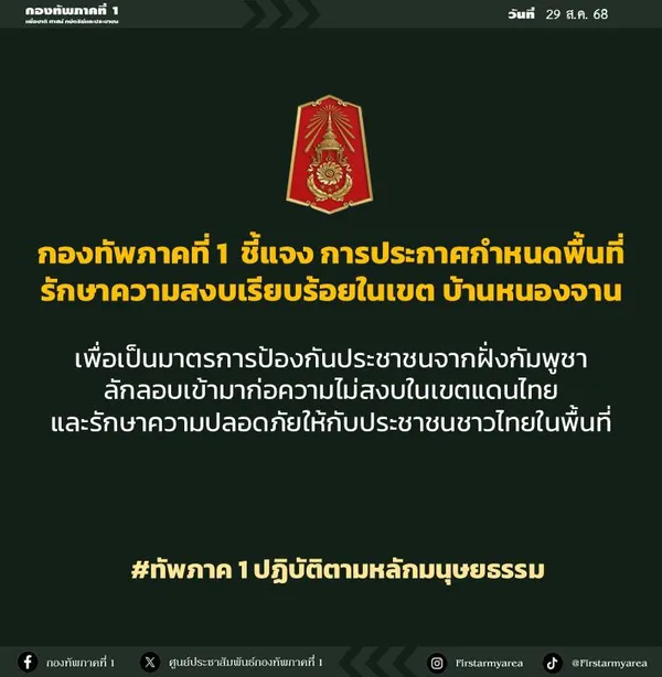 กองทัพภาคที่ 1 ชี้แจง การประกาศกำหนดพื้นที่รักษาความสงบเรียบร้อยในเขตบ้านหนองจาน