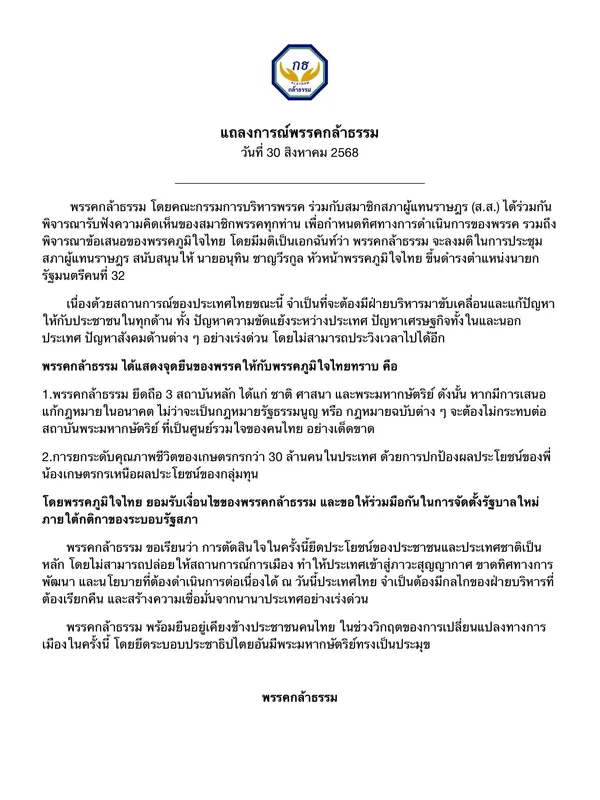 แถลงการณ์พรรคกล้าธรรม พรรคกล้าธรรม โดยคณะกรรมการบริหารพรรค ร่วมกับสมาชิกสภาผู้แทนราษฎร (ส.ส.) ได้ร่วมกันพิจารณารับฟังความคิดเห็นของสมาชิกพรรคทุกท่าน เพื่อกำหนดทิศทางการดำเนินการของพรรค รวมถึงพิจารณาข้อเสนอของพรรคภูมิใจไทย โดยมีมติเป็นเอกฉันท์ว่า พรรคกล้าธรรม จะลงมติในการประชุมสภาผู้แทนราษฎร สนับสนุนให้ นายอนุทิน ชาญวีรกูล หัวหน้าพรรคภูมิใจไทย ขึ้นดำรงตำแหน่งนายกรัฐมนตรีคนที่ 32