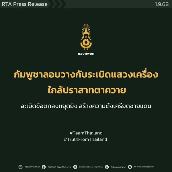 กองทัพบกได้รับรายงานจากกองทัพภาคที่ 2 กรณีเมื่อวันที่ 31 ส.ค. 68 เวลาประมาณ 11.50 น. กองร้อยอาวุธเบาที่ 1 กองพันทหารราบที่ 27 ตรวจพบการวางกับระเบิดแสวงเครื่อง ในลักษณะใช้ลูกกระสุนเครื่องยิงลูกระเบิดประกอบกับการใช้ลวดสะดุดของทหารกัมพูชา ในพื้นที่ทิศตะวันตกของปราสาทตาควาย ห่างจากเนิน 350 ประมาณ 1.7 กิโลเมตร ต.บักได อ.พนมดงรัก จ.สุรินทร์ ใกล้กับบริเวณแนวการวางลวดหนามป้องกันตนเองในเขตไทย
