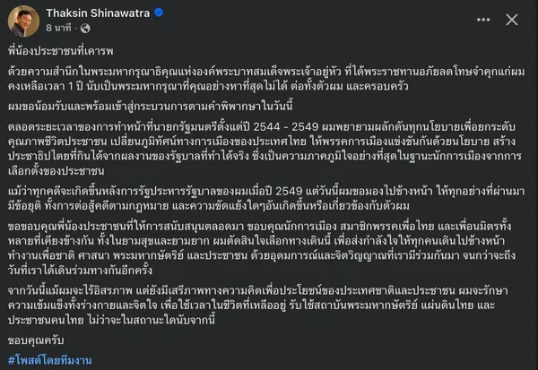 ทีมงานของนายทักษิณ ชินวัตร อดีตนากรัฐมนตรี เปิดเผยข้อความของนายทักษิณ ผ่านเพจเฟสบุ๊ค Thaksin Shinawatra