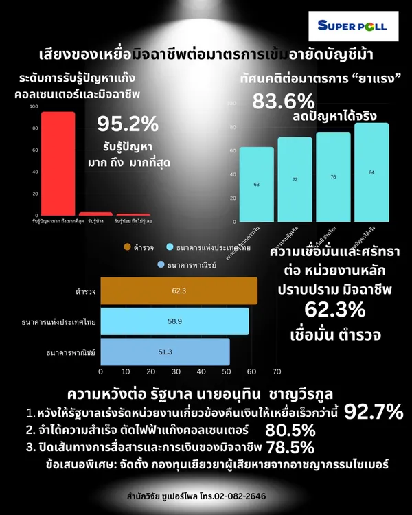 นอกจากนี้ ร้อยละ 63.2 มองว่าวิกฤตการอายัดบัญชีที่ส่งผลต่อผู้บริสุทธิ์สามารถพลิกเป็นโอกาสในการยกระดับความเชื่อมั่นต่อระบบการเงินของประเทศ ส่วนร้อยละ 27.4 เห็นว่าจำเป็นต้องทำอย่างต่อเนื่องแม้จะมีผลกระทบ และมีเพียงร้อยละ 1.1 เท่านั้นที่ไม่เห็นด้วยกับมาตรการอายัดบัญชีม้าอย่างเด็ดขาด ผลลัพธ์นี้สะท้อนสมการสังคมที่ซับซ้อน กล่าวคือ ประชาชนส่วนใหญ่สนับสนุนความเข้มแข็งของรัฐ แต่ก็เรียกร้องให้ความเข้มแข็งนั้นอยู่บนพื้นฐานของความละเอียดรอบคอบและเป็นธรรม