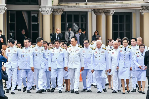 ก่อนที่ในเวลา 16.00 น. จะนำคณะรัฐมนตรีทั้งหมด ออกเดินทางจากทำเนียบรัฐบาลโดยรถตู้ที่สำนักเลขาธิการนายกรัฐมนตรีจัดเตรียมไว้ ไปยังพระที่นั่งอัมพรสถาน พระราชวังดุสิต เพื่อเข้าเฝ้าฯ ถวายสัตย์ปฏิญาณก่อนเข้ารับหน้าที่