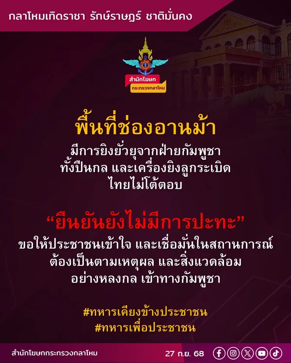 เพจกองทัพบกทันกระแส และ สำนักโฆษกกระทรวงกลาโหม รายงานว่าเหตุดังกล่าวเป็นการ ยิงยั่วยุจากฝ่ายกัมพูชา โดยปืนกล และเครื่องยิงลูกระเบิด ทางฝั่งกองกำลังของประเทศไทยไม่ได้มีการตอบโต้ และ ยืนยันว่ายังไม่มีเหตุปะทะ พร้อมกับระบุว่า “ขอให้ประชาชนเข้าใจ และเชื่อมั่นในสถานการณ์ต้องเป็นไปตามเหตุผลและสิ่งแวดล้อม อย่าหลงกล เข้าทางกัมพูชา”
