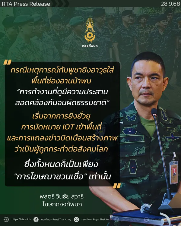 กองทัพบกออกแถลงกรณี เหตุการณ์กัมพูชายิงอาวุธหลายขนาดใส่พื้นที่ช่องอานม้า เป็นการวางแผนล่วงหน้า ทั้งการยั่วยุด้วยอาวุธ การนัดหมายคณะ IOT เข้าพื้นที่ และการแถลงบิดเบือนกล่าวหาไทย ทั้งหมดเป็นเพียง “การสร้างสถานการณ์” ของฝ่ายกัมพูชา เมื่อวานนี้