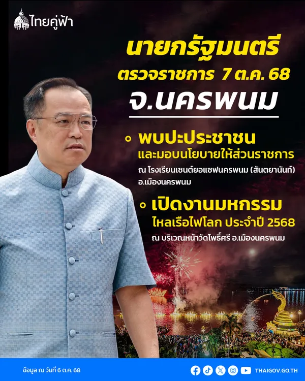 นายกฯ เตรียมลงพื้นที่นครพนม 7 ตุลาคม 2568 มอบนโยบายรัฐบาล - เปิดงาน “มหกรรมไหลเรือไฟโลก 2568” ยกระดับเทศกาลเรือไฟไทยสู่เรือไฟโลก
