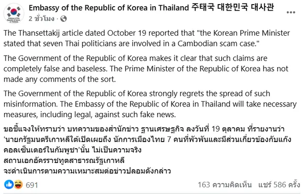 โฆษกรัฐบาลเปิดเผยว่าสถานเอกอัครราชทูตสาธารณรัฐเกาหลีประจำประเทศไทยได้ออกแถลงการณ์อย่างเป็นทางการแล้ว โดยระบุชัดว่า “บทความของสำนักข่าวฐานเศรษฐกิจลงวันที่ 19 ตุลาคม 2568 ซึ่งรายงานว่านายกรัฐมนตรีเกาหลีใต้กล่าวถึงนักการเมืองไทย 7 คนที่เกี่ยวข้องกับคดีสแกมเมอร์ในกัมพูชา ไม่เป็นความจริง” พร้อมทั้งยืนยันว่ารัฐบาลเกาหลีใต้จะดำเนินการตามความเหมาะสมต่อข่าวปลอมดังกล่าว เพื่อปกป้องความถูกต้องของข้อมูลและชื่อเสียงของบุคคลที่ถูกพาดพิง