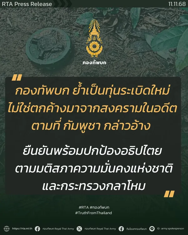 พลตรี วินธัย สุวารี โฆษกกองทัพบก ได้ออกมายืนยันว่า แม้ว่าในกรณีดังกล่าวทางกัมพูชาจะได้ออกมาระบุว่าเป็นทุ่นระเบิดเก่าจากสงครามในอดีต แต่ผลจากการตรวจพิสูจน์หลักฐานยืนยันได้ว่า เป็นการลักลอบเข้ามาวางทุ่นระเบิดใหม่ในพื้นที่เขตไทย และยังมีการตรวจพบทุ่นระเบิดอีกจำนวน 3 ทุ่น ในบริเวณใกล้เคียง การกระทำดังกล่าวแสดงให้เห็นว่า ฝ่ายกัมพูชาขาดความจริงใจในการปฏิบัติตามข้อตกลงที่ได้ลงนามร่วมกันไว้ และละเมิดอนุสัญญาออตตาวา ส่งผลให้กระบวนการขับเคลื่อนสันติภาพระหว่างประเทศต้องยุติลงกลางคัน
