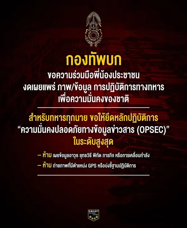 กองทัพบกขอความร่วมมือพี่น้องประชาชน รวมถึงกำลังพลทุกนาย งดเผยแพร่ภาพหรือข้อมูลเกี่ยวกับการปฏิบัติการทางทหาร เพื่อป้องกันไม่ให้ข้อมูลสำคัญถูกนำไปวิเคราะห์ต่อยอด จนส่งผลกระทบต่อความปลอดภัยของทหารในพื้นที่และความมั่นคงของประเทศ