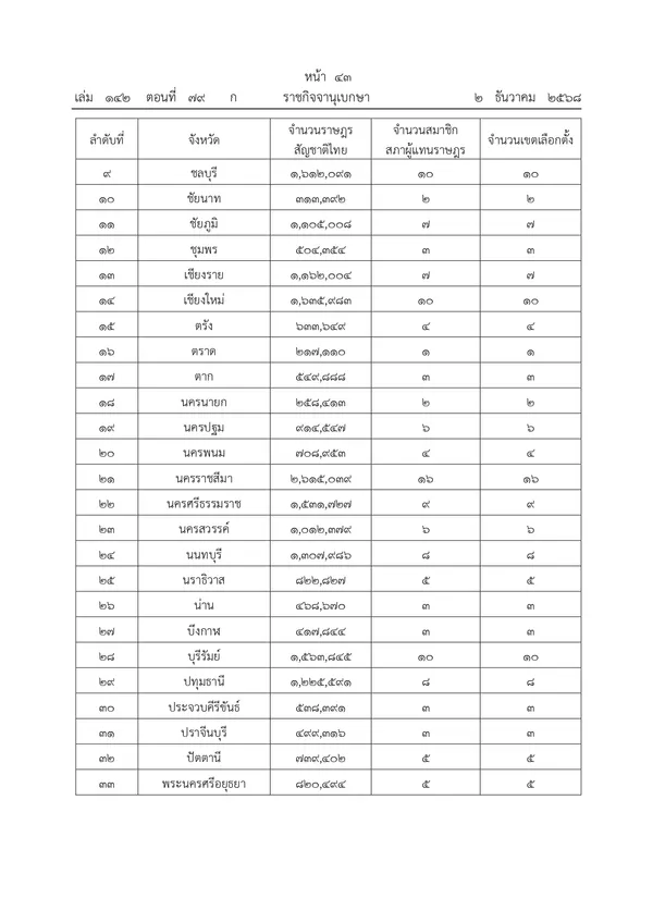ราชกิจจานุเบกษา ประกาศคณะกรรมการการเลือกตั้ง (กกต.) เรื่องจำนวนสมาชิกสภาผู้แทนราษฎรแบบแบ่งเขตเลือกตั้งและเขตเลือกตั้งของแต่ละจังหวัดจะพึงมี