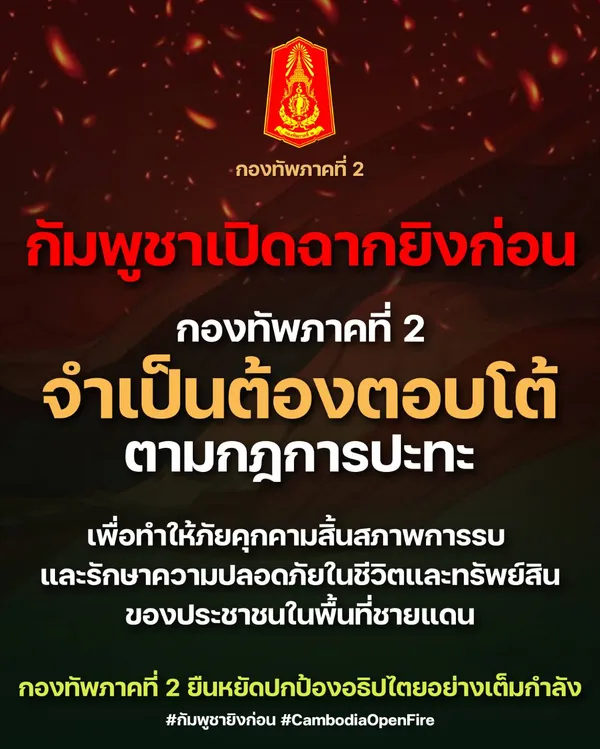กัมพูชาเปิดฉากยิงก่อน กองทัพภาคที่ 2 จำเป็นต้องตอบโต้ ตามกฎการปะทะ เพื่อทำให้ภัยคุกคามสิ้นสภาพการรบและรักษาความปลอดภัยในชีวิตและทรัพย์สิน ของประชาชนในพื้นที่ชายแดน
