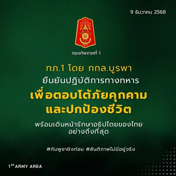 กองทัพภาคที่ 1 โดย กกล.บูรพา ขอยืนยันว่าจะยังคงเดินหน้าปฏิบัติการอย่างเต็มกำลังความสามารถ ภายใต้กฎการปะทะและสิทธิในการป้องกันตนเอง จนกว่าภัยคุกคามในพื้นที่ชายแดน จ.สระแก้ว จะยุติเพื่ออธิปไตยของไทยและความปลอดภัยของพี่น้องประชาชนเป็นสำคัญ