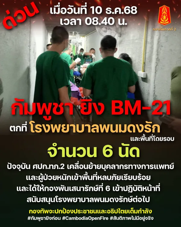 กองทัพภาคที่ 2 แจ้งเมื่อวันที่ 10 ธ.ค.68 เวลา 08.40 น. "กัมพูชา ยิง BM-21 ตกที่โรงพยาบาลพนมดงรัก" และพื้นที่โดยรอบ จำนวน 6 นัด ปัจจุบัน ศปก.ทก.2 ได้เคลื่อนย้ายบุคลากรทางการแพทย์ และผู้ป่วยหนักเข้าพื้นที่หลบภัยเรียบร้อย และได้ให้กองพันเสนารักษ์ที่ 6 เข้าปฏิบัติหน้าที่ สนับสนุนโรงพยาบาลพนมดงรักษ์ต่อไป กองทัพจะปกป้องประชาชนและอธิปไตยเต็มกำลัง