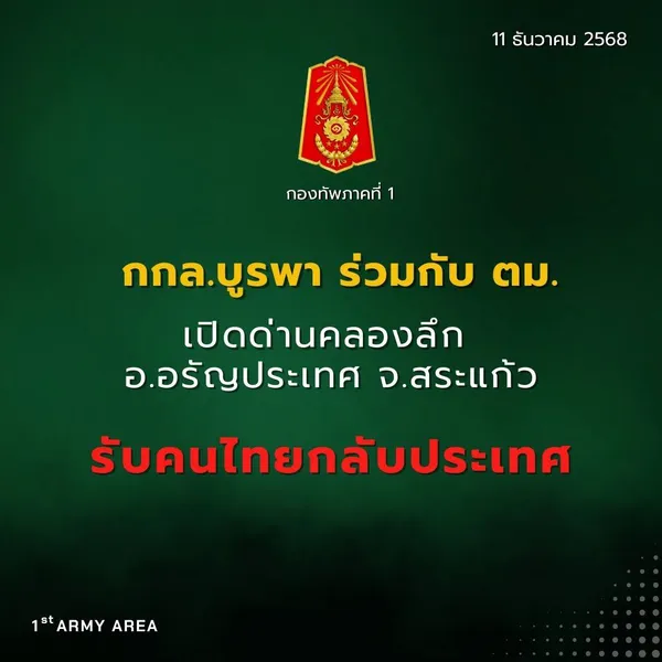 11 ธันวาคม 2568 ศูนย์ปฏิบัติการกองทัพภาคที่ 1 รายงานสถานการณ์บริเวณด่านคลองลึก อ.อรัญประเทศ จ.สระแก้ว วันนี้ฝ่ายไทยจะเตรียมการเปิดด่านคลองลึกรับคนไทยจากฝั่งปอยเปต ประเทศกัมพูชากลับประเทศ ตั้งแต่ห้วงเวลา 10.00 น. เป็นต้นไป