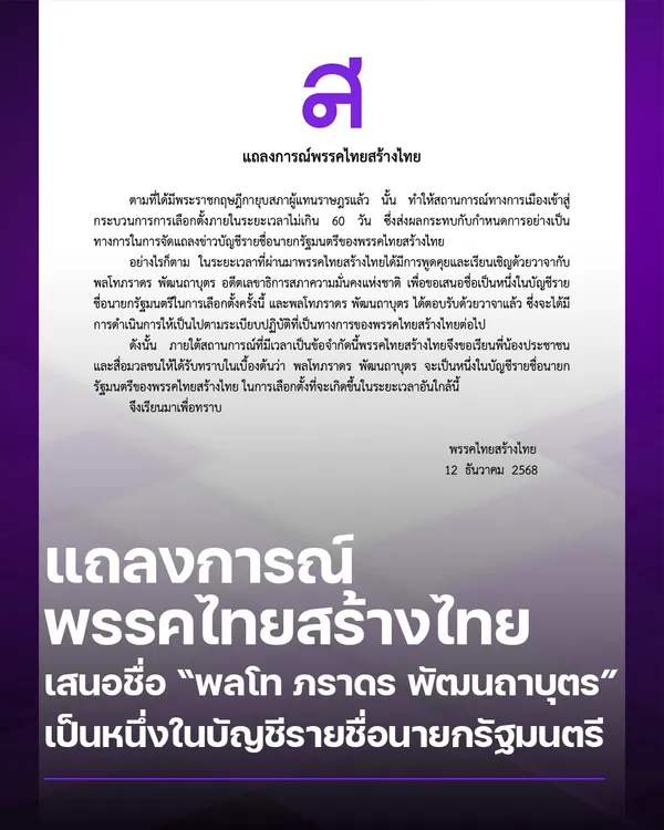 12 ธันวาคม 2568 ผู้สื่อข่าวรายงานว่า พรรคไทยสร้างไทย แถลงการณ์ ตามที่ได้มีพระราชกฤษฎีกายุบสภาผู้แทนราษฎรแล้ว นั้น ทำให้สถานการณ์ทางการเมืองเข้าสู่กระบวนการการเลือกตั้งภายในระยะเวลาไม่เกิน 60 วัน ซึ่งส่งผลกระทบกับกำหนดการอย่างเป็นทางการในการจัดแถลงข่าวบัญชีรายชื่อนายกรัฐมนตรีของพรรคไทยสร้างไทย