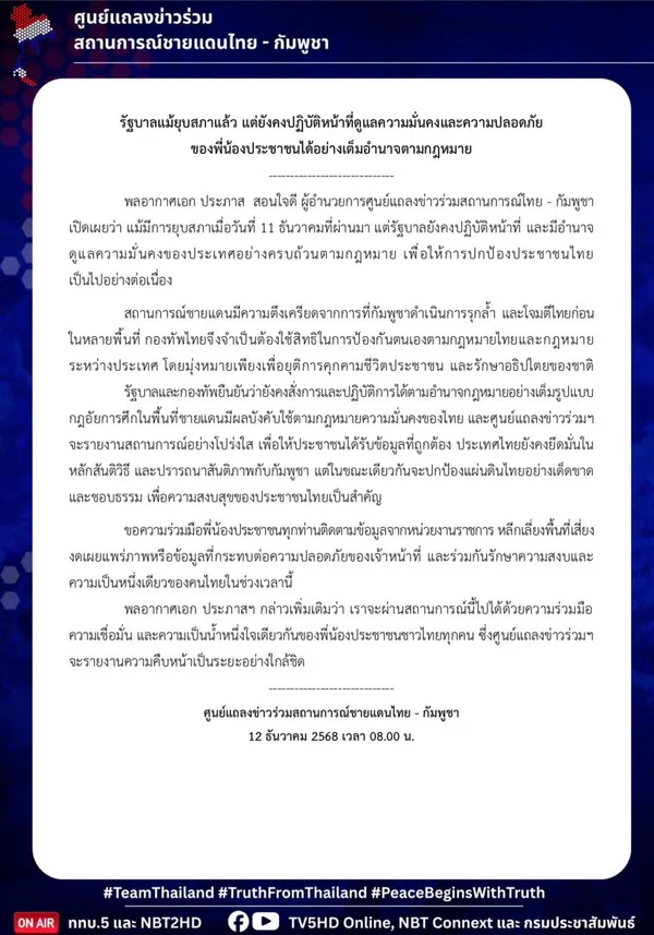 รัฐบาลและกองทัพยืนยันว่ายังคงสั่งการ และปฏิบัติการได้ตามอำนาจกฎหมายอย่างเต็มรูปแบบ กฎอัยการศึกในพื้นที่ชายแดนมีผลบังคับใช้ตามกฎหมายความมั่นคงของไทย และศูนย์แถลงข่าวร่วมฯ จะรายงานสถานการณ์อย่างโปร่งใส เพื่อให้ประชาชนได้รับข้อมูลที่ถูกต้อง ประเทศไทยยังคงยึดมั่นในหลักสันติวิธี และปรารถนาสันติภาพกับกัมพูชา แต่ในขณะเดียวกันจะปกป้องแผ่นดินไทยอย่างเด็ดขาด และชอบธรรม เพื่อความสงบสุขของประชาชนไทยเป็นสำคัญ
