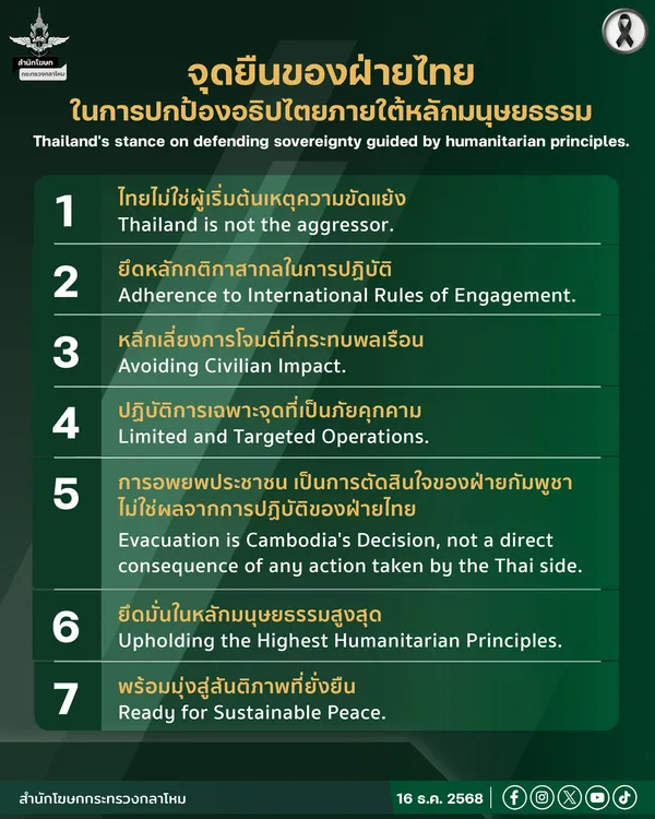 สำนักโฆษกกระทรวงกลาโหม เผยแพร่ข้อความผ่านเฟซบุ๊ก โดยระบุถึงจุดยืนของฝ่ายไทย ในการปกป้องอธิปไตยภายใต้หลักมนุษยธรรม