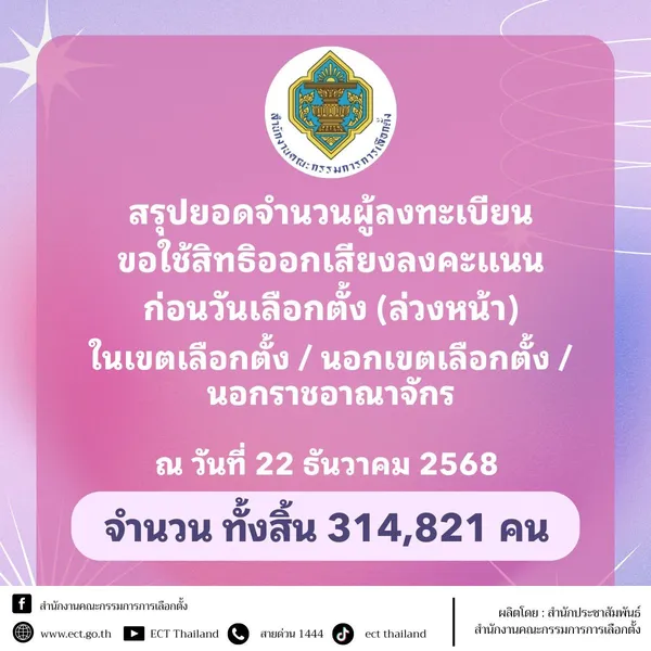 ทั้งนี้ รวมจำนวนผู้มีสิทธิเลือกตั้ง ยื่นขอลงทะเบียนใช้สิทธิเลือกตั้งล่วงหน้า ทั้งในเขตเลือกตั้ง นอกเขตเลือกตั้ง และนอกราชอาณาจักร ตั้งแต่วันที่ 20 ธันวาคม 2568 มีทั้งสิ้น 314,821 คน