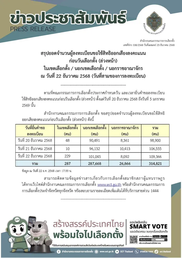 สำนักงานคณะกรรมการการเลือกตั้ง (กกต.) สรุปยอดจำนวนผู้ลงทะเบียนขอใช้สิทธิออกเสียงลงคะแนนก่อนวันเลือกตั้ง (ล่วงหน้า) ในเขตเลือกตั้ง / นอกเขตเลือกตั้ง / นอกราชอาณาจักร ณ วันที่ 22 ธันวาคม 2568 (วันที่สามของการลงทะเบียน)