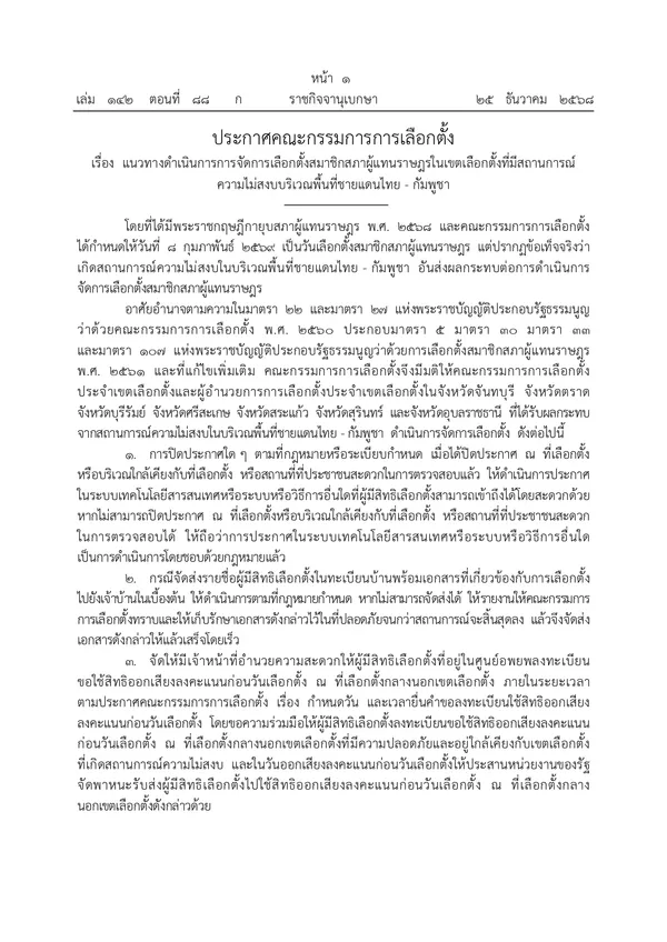 วันนี้ 26 ธันวาคม 2568 ผู้สื่อข่าวรายงานว่า เว็บไซต์ราชกิจจานุเบกษา ได้เผยแพร่ประกาศคณะกรรมการการเลือกตั้ง (กกต.) เรื่อง แนวทางดำเนินการการจัดการเลือกตั้งสมาชิกสภาผู้แทนราษฎรในเขตเลือกตั้งที่มีสถานการณ์ ความไม่สงบบริเวณพื้นที่ชายแดนไทย - กัมพูชา