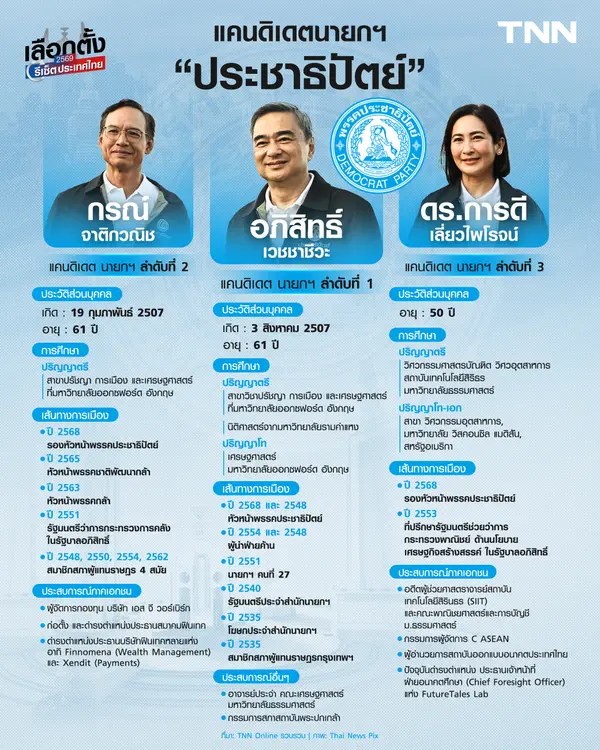 26 ธันวาคม 2568 พรรคประชาธิปัตย์ (ปชป.) เผยแพร่คลิปเปิดตัว 3 แคนดิเดตนายกรัฐมนตรีของพรรคฯ สำหรับการเลือกตั้ง สส. 8 กุมภาพันธ์นี้ อย่างเป็นทางการ ประกอบด้วย นายอภิสิทธิ์ เวชชาชีวะ หัวหน้าพรรคฯ, นายกรณ์ จาติกวณิช รองหัวหน้าพรรคฯ และนางการดี เลียวไพโรจน์ รองหัวหน้าพรรคฯ