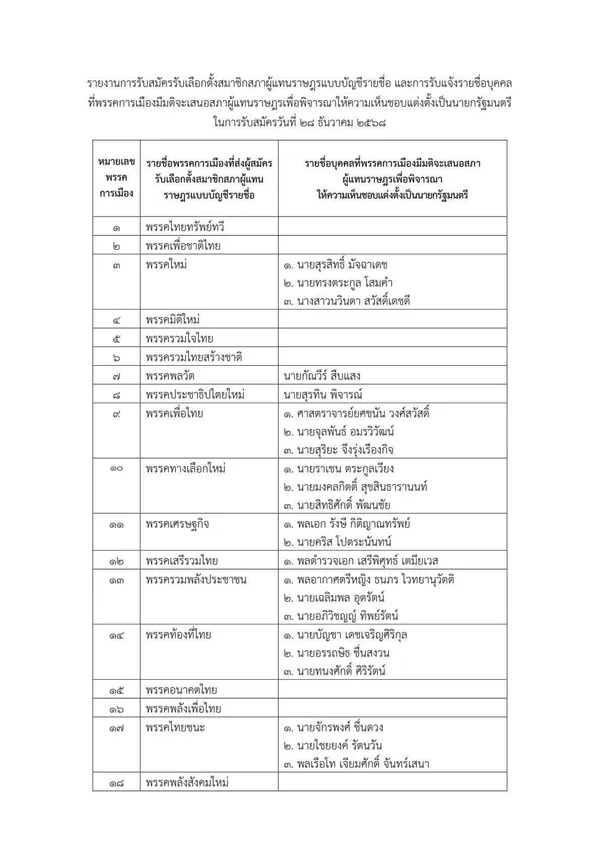 30. พรรคประชาไทย เสนอชื่อแคนดิเดตนายกรัฐมนตรี 1 คน