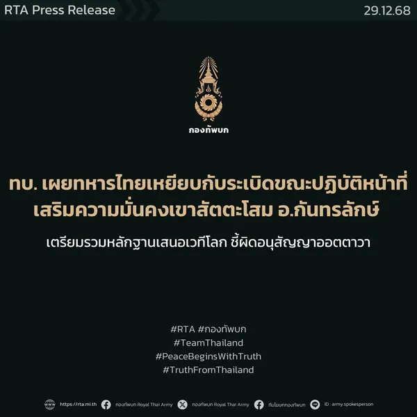 กองทัพบกขอยืนยันว่า หลักฐานการวางทุ่นระเบิดสังหารบุคคลในทุกกรณี บ่งชี้ชัดเจนว่าฝ่ายกัมพูชายังคงมีการใช้ทุ่นระเบิดซึ่งถือเป็นการละเมิดพันธกรณีระหว่างประเทศ ภายใต้อนุสัญญาว่าด้วยการห้ามใช้ การสะสม การผลิต และการโอนทุ่นระเบิดสังหารบุคคล และการทำลายทุ่นระเบิดดังกล่าว (อนุสัญญาออตตาวา) อย่างร้ายแรง ถือเป็นการกระทำที่ขัดต่อหลักมนุษยธรรมสากลและเป็นสิ่งที่ประชาคมโลกไม่อาจยอมรับได้