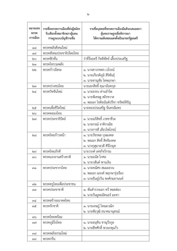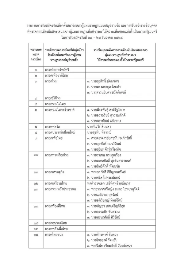 - รวมพรรคการเมืองที่เสนอรายชื่อฯ จำนวน 35 พรรคการเมือง - รวมพรรคการเมืองเสนอรายชื่อบุคคลให้สภาผู้แทนราษฎรพิจารณาให้ความเห็นชอบแต่งตั้งเป็นนายกรัฐมนตรี จำนวน 76 รายชื่อ